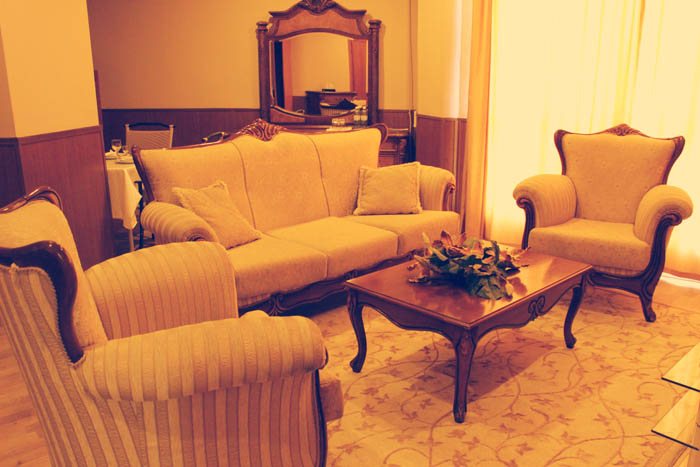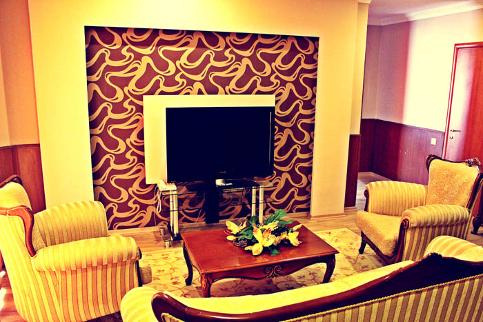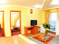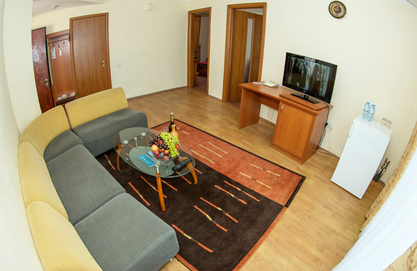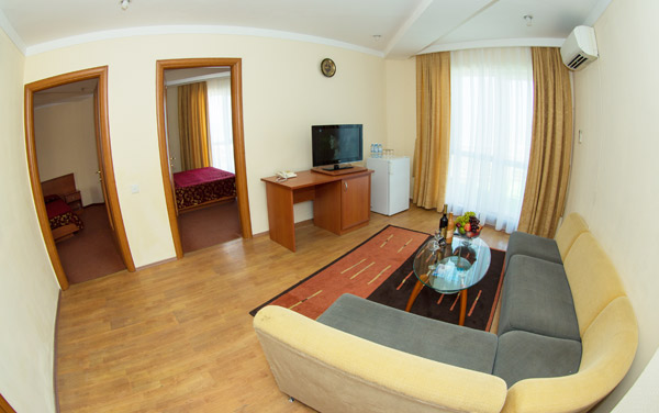 consists of 3 rooms: 1 room, 2 bed rooms with 2double beds, 2 bath rooms (one with shower and bin the other). The room has: satellite TV, WI-FI internet access, central air conditioning, direct dial telephone with the city through «9», carpet, hair dryer, make-up mirror, toiletries, towels, bathrobes, slippers, shoe horn, wardrobe, corner sofa, coffee table, mid-size refrigerator, bottled water. There is a terrace overlooking the sea/water park.